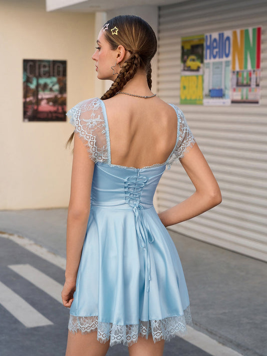 Floral Jacquard Lace Up Backless Split Hem Satin Dress